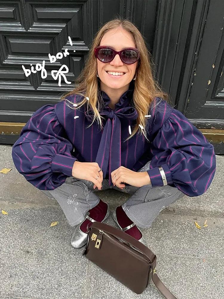 Women's Striped Lace-Up Blouse – Color Block, Round Neck, Long Sleeve Casual Shirt
