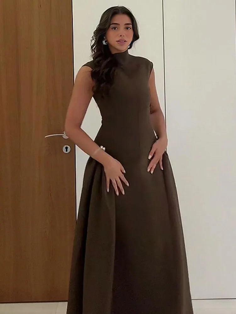 Women's Elegant V-Neck Contrast Maxi Dress – Sleeveless, Pleated, Backless Evening Gown