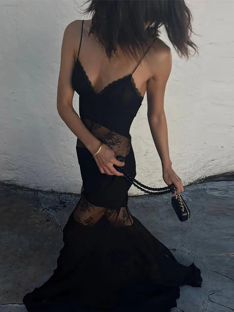 Women's Sexy Black Lace Maxi Dress – Sleeveless, Backless, See-Through Slim Fit Evening Gown